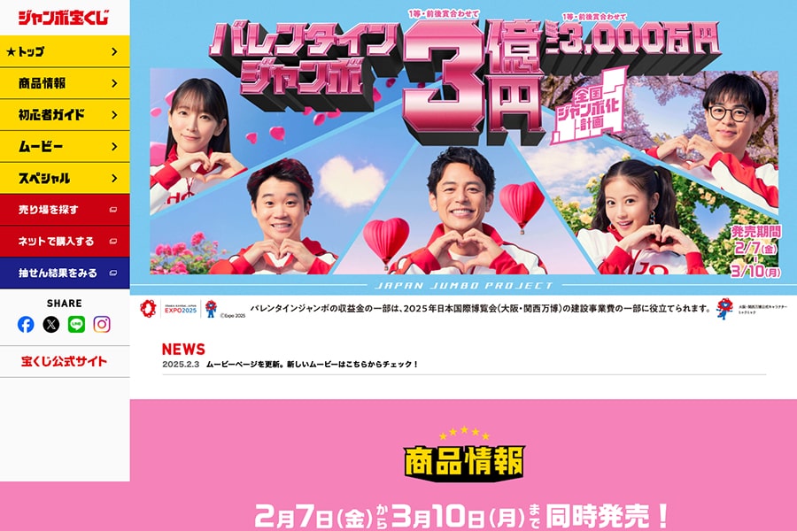 ※ジャンボ宝くじブランド公式HPよりキャプチャー画像|2025年のバレンタインジャンボ宝くじについての掲載の様子