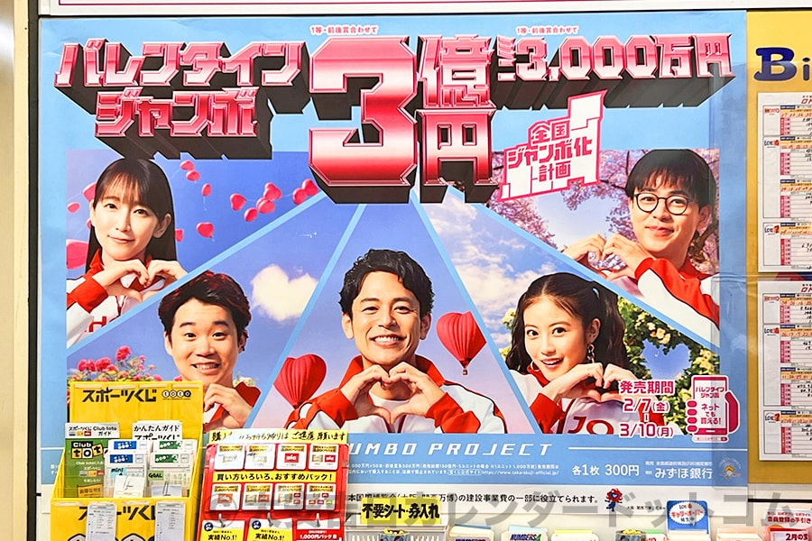 ※前年2025年バレンタインジャンボ宝くじ宝くじ売り場の大ポスターの様子(発売初日に撮影)|撮影:大安吉日カレンダードットコム