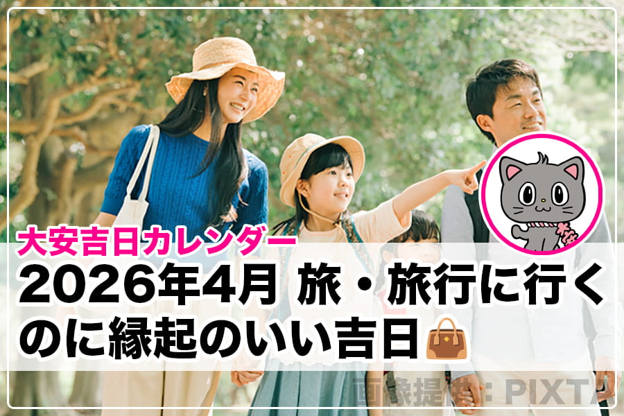 このページでは、2026年4月の旅・旅行に行くのに縁起のいい吉日を分かりやすくカレンダー形式でご紹介。開運を意識した出発日選びや安心して旅を楽しみたい方、次の旅行を、より気持ちよくスタートさせたい方はぜひ参考にしてください。