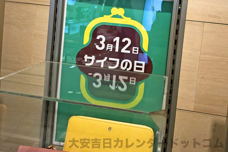 ※某百貨店の財布売り場に設置された「3月12日 サイフの日」ディスプレーの様子|撮影:大安吉日カレンダードットコム