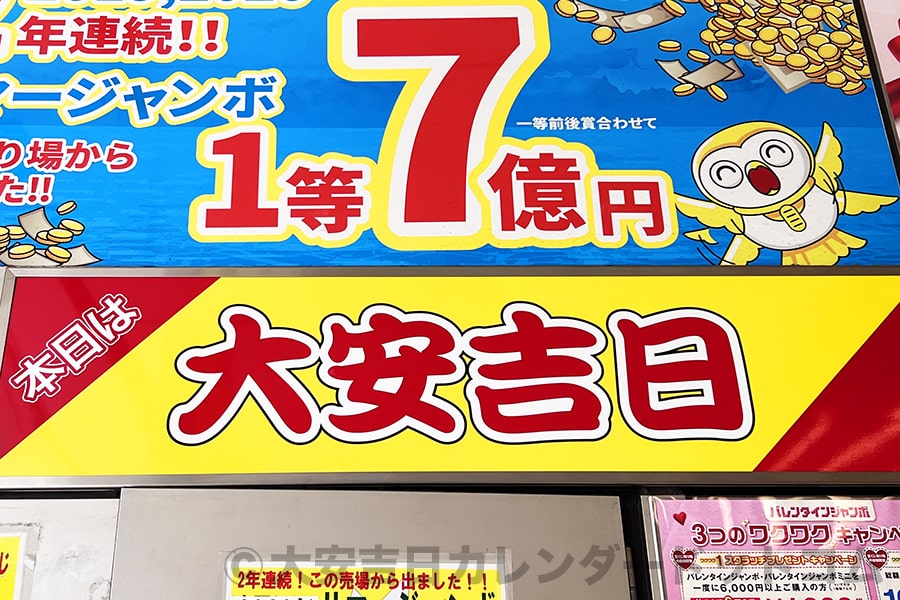 ※宝くじ売り場に貼られた「本日は大安吉日」のディスプレーの様子(ジャンボ宝くじは大安に買う人が多いので、宝くじ売り場もこのように大安吉日であることをアピールするのです)|画像提供:大安吉日カレンダードットコム