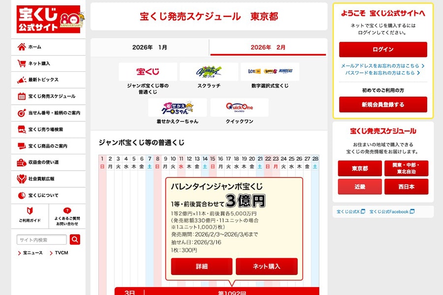 ジャンボ宝くじ公式サイトにて、2026年のバレンタインジャンボ宝くじの発売スケジュールが確定になりました。