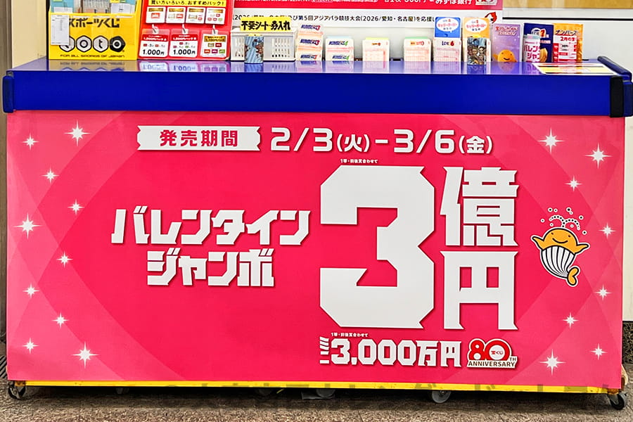 ※2026年のバレンタインジャンボ宝くじ売り場の大ポスターの様子(2026年 発売初日に購入・撮影)|画像提供:大安吉日カレンダードットコム