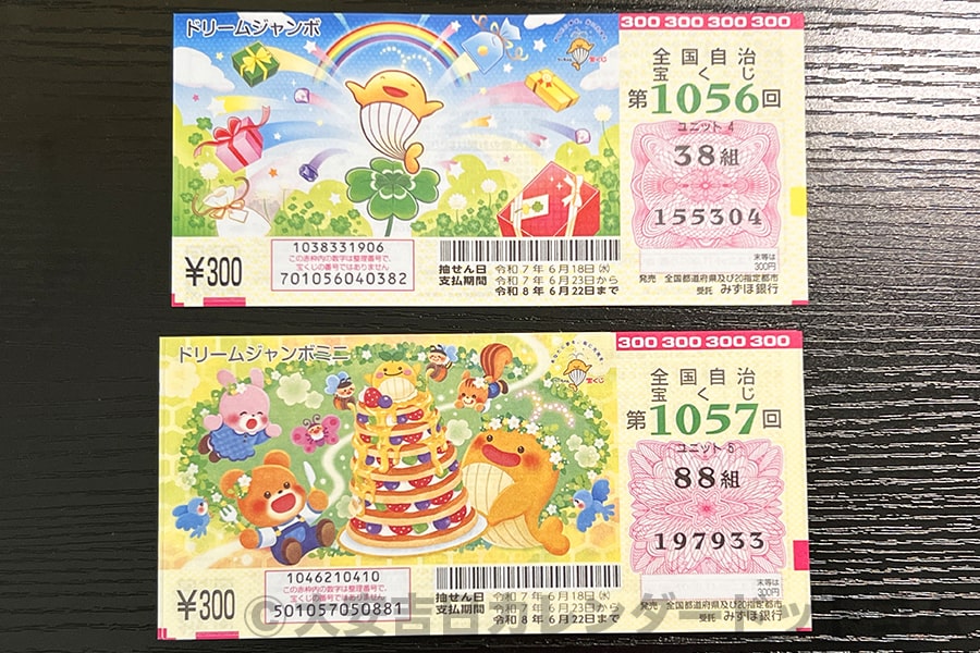 ※前年2025年のドリームジャンボ宝くじとドリームジャンボミニの現物(発売初日に実際に購入)|撮影:大安吉日カレンダードットコム