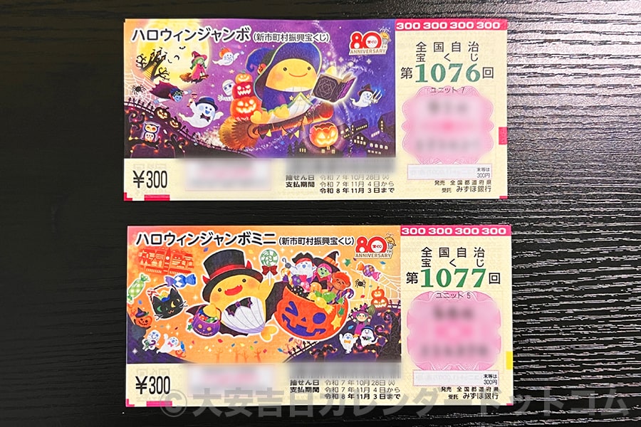 ※前年2025年のハロウィンジャンボ宝くじとハロウィンジャンボミニの現物(発売初日に実際に購入)|撮影:大安吉日カレンダードットコム