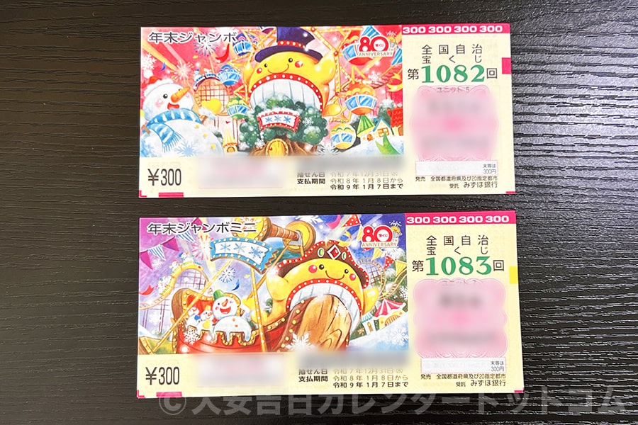※前年2025年の年末ジャンボ宝くじと年末ジャンボミニの現物(発売初日に実際に購入)|撮影:大安吉日カレンダードットコム