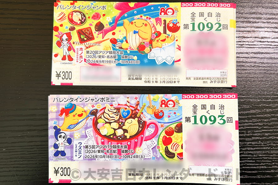※2026年のバレンタインジャンボ宝くじとバレンタインジャンボミニの現物(発売初日に実際に購入)|撮影:大安吉日カレンダードットコム